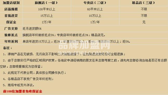A级店:人口在150万以上的省会、发达城市,有效经营面积为120平方米以上的一类、二类商业街的独立店铺,首次投资50万以上。