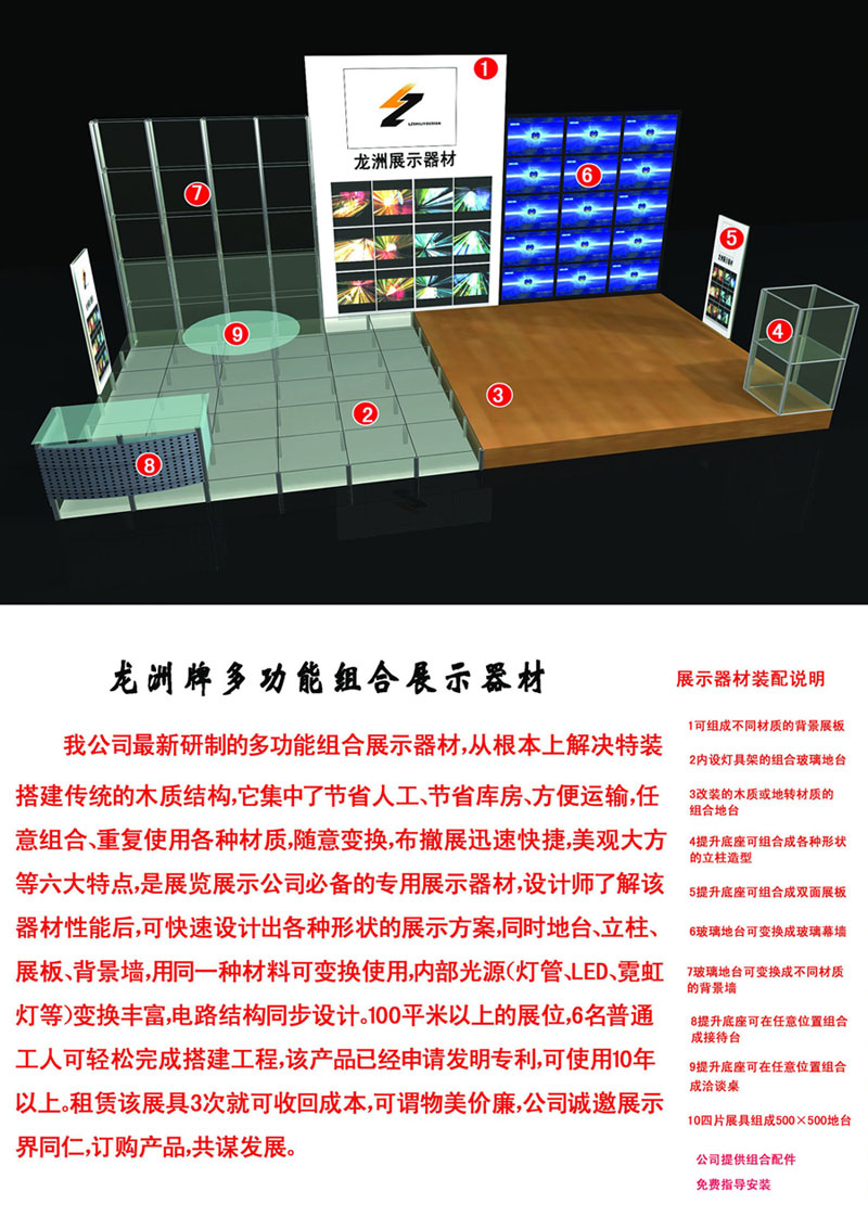 - 我公司最新研制的多功能组合展示器材(已申请专利),从根本上解决特装搭建传统的木质结构,它集中了节省人工.节省库房.方便运输.任意组合.重复使用各种材质,随意变换,布撤展迅速快捷,美观大方等六大特点,是展览展示公司必备的专用展示器材,设计师了解该器材的性能后,可快速设计出各种形状的展示方案,同时地台.立柱.展板,背景墙,…