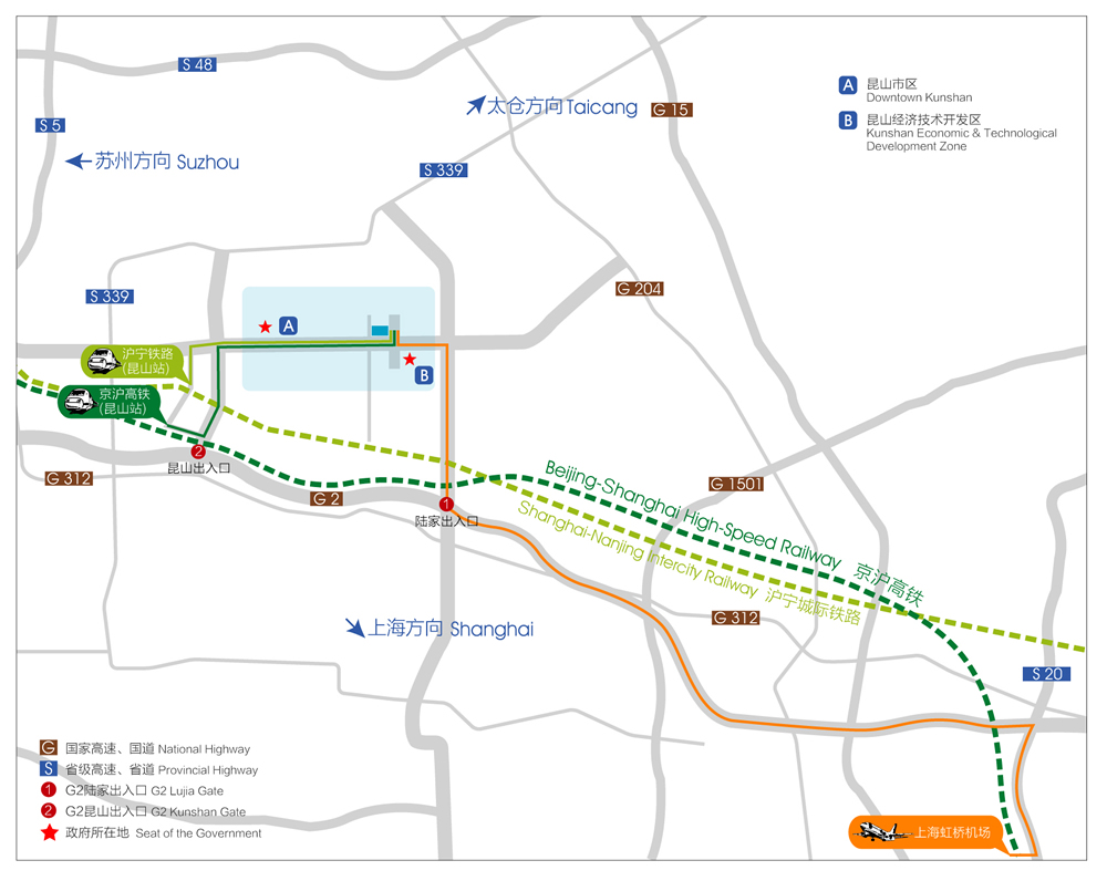 昆山地理位置优越,交通便捷,货物经区内水道运达各港口可直接出口。即将建成的京沪高铁 及沪宁城际铁路穿城而过,届时昆山来往上海只需15分钟。