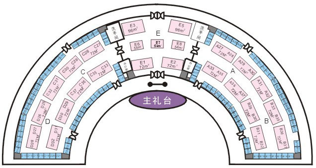 1号馆: 展厅长 193 米,宽 30 米,高 18 米,总建筑面积 10,000 万平方米。呈半圆形状。可设350个国际标准展位,展厅可同时使用,也可分隔为 A、B 、C 、D 、E 七个展区单独使用,展厅内设有 IDD 接口,各接口均有电源、信息端口。并设有中央空调。展厅后有货物装卸平台、休闲区、服务区、泊车场等。