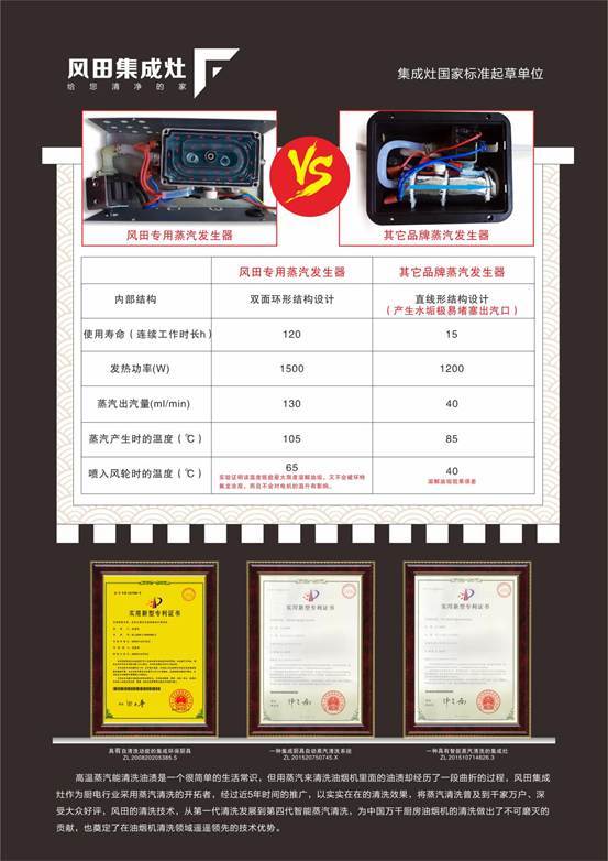 中山市风田集成厨卫电器有限公司是拥有自主研发、生产、销售于一体的大型集成灶生产企业,累计共获得40多项国家专利。公司自主研发的高温蒸汽清洗专利,更是通过不断的市场检验已获得广大消费者的认可。于是集成灶市场出现了一股跟风、模仿流,一些不具备资质、杂牌集成灶品牌也开始宣传自己拥有高温蒸汽清洗技术,从而导致消费者无法辨别真伪,上当受骗。