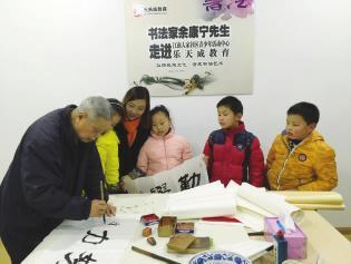 86岁高龄的余康宁先生是中国书法家协会会员,也是一位热心公益事业的老书法家,其作品曾在我市多个镇巡展,深受群众好评。这次余老先生应邀来到江南人家社区青少年活动中心,主要是现场书写格言、警句等有教育意义的书法,传播传统文化。他在与围观的学生们交流书法艺术时,鼓励他们从小要练好字,并询问大家的学习情况。现场的学生们十分珍惜与书画名家零距离接触的机会,虚心请教书法大师并合影留念,有的还获得了余老现场赠送的墨宝,喜悦之情溢于言表。