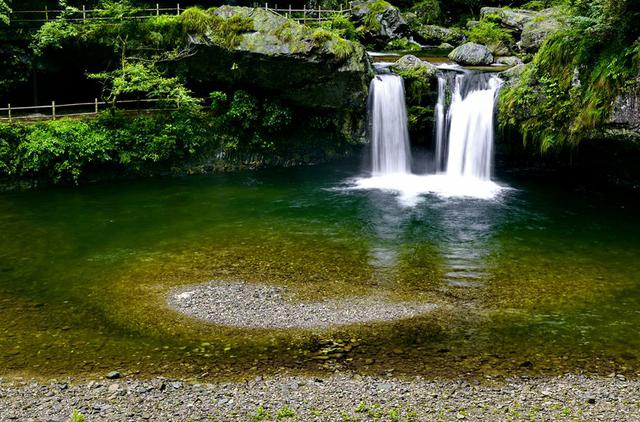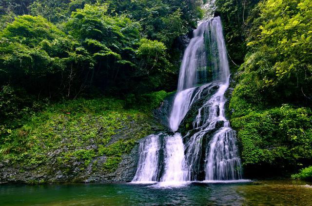 五溪山之美,美在它有众多瀑布飞泉,一条条瀑布,如白练凌空悬挂,从淡紫石和淡黄色石壁倾然而下,溪水长流,滚珠泻玉。