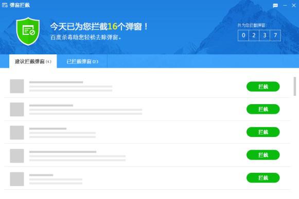 如果说更强的病毒查杀能力造就更少的病毒骚扰,带来的是电脑的平静,那么百度杀毒5.0新增的弹窗拦截功能,则为用户带来了更安静的网络体验。对于一些用户反映强烈、弹出频繁且极为影响上网体验的新闻及广告弹窗,百度杀毒这次没有手下留情,此外百度杀毒自身并不提供多余的弹窗,也不会推荐不需要的软件,在后台工作、安静的守护用户电脑安全,让用户真正主导自己的电脑。