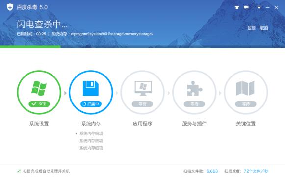 以“雪狼引擎”的核心技术升级作为基础,百度杀毒5.0让用户在下载程序时、接收文件传输时、网购时都能够很放心,出现病毒能够在第一时间给予查杀。平时,百度杀毒5.0低调守护,默默工作,用户无论是工作、游戏、上网时都不会感受到它的存在,带来更为流畅、清新的体验。打开电脑时,你要找的“静静”,就已经在右下角了。