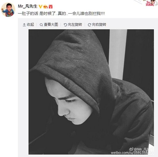吴亦凡在微博晒出身穿黑色上衣,戴着帽子的照片,留言称,“一肚子的话,是时候了,真的,一会儿谁也别拦我”。照片中,吴亦凡戴着帽子微微低头,露出白皙面部和忧郁眼神。