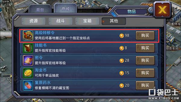 通过游戏早期的任务奖励,玩家在可以购买“高级转移令”,利用这个道具,玩家可以转移基地到大地图上任何一个地方。