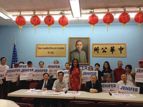 【侨报记者叶永康6月21日纽约报道】挑战市议员陈倩雯的第一选区市议员印裔参选人珍妮花(Jenifer Rajkumar)20日前往中华公所拜票,介绍自己的政纲,并对华埠的经济、教育、交通等问题发表看法。十多名华埠商家出席,但到场的侨领未见踊跃,大多表示中立。