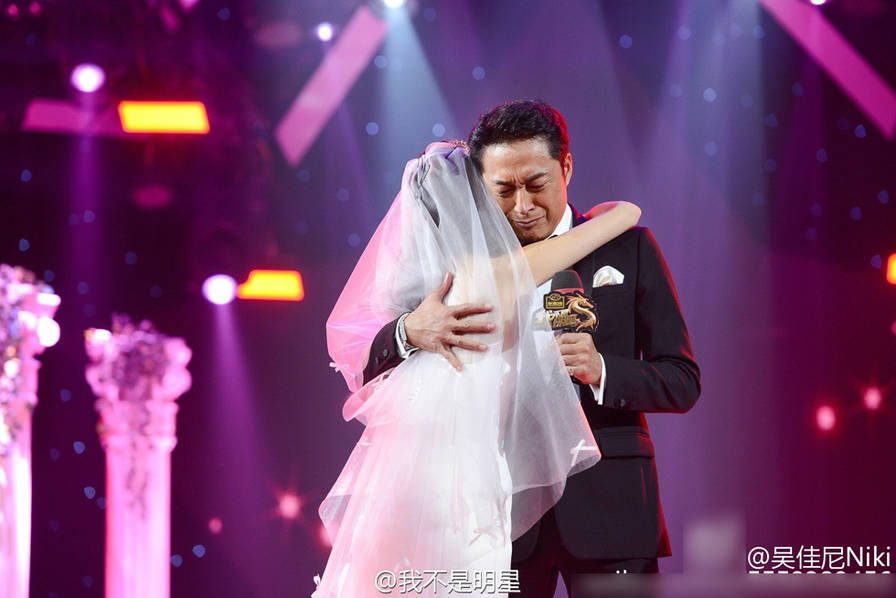 现场,马景涛一圆心愿,在节目组的帮助下为吴佳尼呈现了一场盛大婚礼,在主持人鸥哥和全场观众的见证下,他再次求婚,当吴佳尼穿着一袭婚纱说出“我愿意”时,这位男子汉流下了感动的泪水。