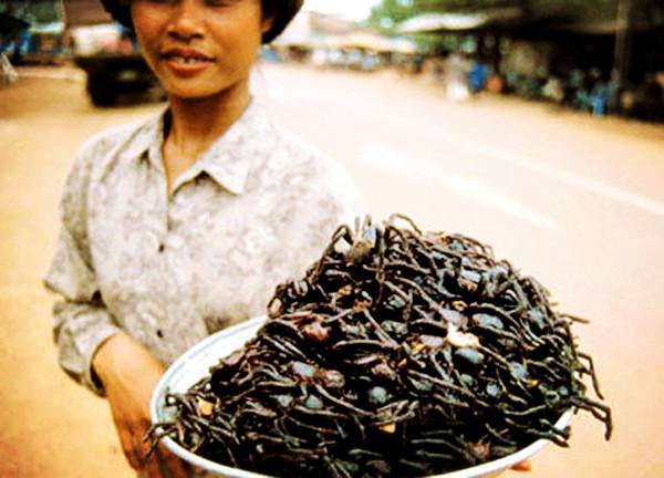 柬埔寨素昆地区出产的一种黑色长毛毒蜘蛛成为了人们餐桌上的美味。当地小贩介绍说,生意好的时候,自己每天能卖出100-200个大蜘蛛。据介绍,这种蜘蛛只要配上大蒜和盐等调料,马上用滚油炸透,立刻就会变得香脆可口,成为一种“无上的美味”,以致于很多外地人在赶到素昆去“大饱口福”后,纷纷带上许多这种“宝贝”回家去慢慢品尝。