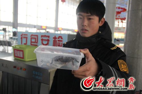 大众网青岛3月18日讯(记者 韩铭 通讯员 李男)体长10厘米、满身覆盖绒毛、捕猎中靠毒液捕食小型哺乳动物……今天上午,交运集团青岛汽车东站来了一位“不速之客”,安检人员在检查行包过程中居然发现了一只装在塑料饭盒中的长达10厘米的毒蜘蛛,而蜘蛛的主人刘先生为了避免自己的宠物被憋死,还在盒盖处留了一丝空隙,并想用这种简陋的方式将蜘蛛带回烟台老家。