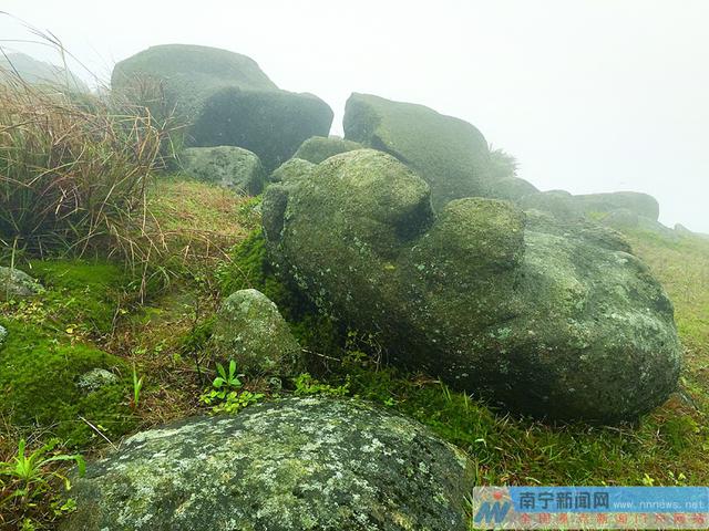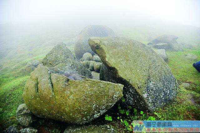 经过2个小时的跋涉,记者一行终于爬到山顶。山顶的雾气十分重,能见度不到10米。山顶随处可见形状各异的怪石,有的横看就像一只躺着的熊猫;有的从中间劈成两半,就像被鬼斧劈开一样……村支书告诉我们,以前名山村青年男女到了婚嫁年龄,就来到山顶石堆,坐在石头上唱山歌找对象。