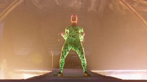 金凯瑞作为一名优秀的喜剧演员,在饰演谜语人这个角色时几乎是沿用了他在《变相怪杰》中的表演风格,都是一个小人物在一种强大力量的掩护下进行着疯狂的举动,只不过作为变相怪杰里他是混乱正义,而作为谜语人他是混乱邪恶。谜语人这个没什么战斗力只靠头脑解决问题的角色在金凯瑞的扮演下非常出彩,他那夸张的表情和形体动作让人过目不忘,成为了经典的反派形象。