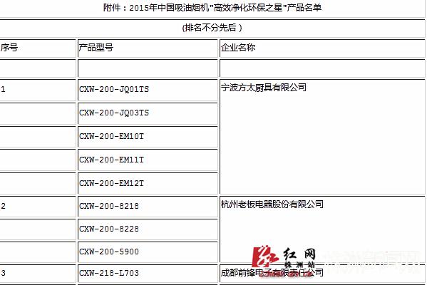 12月15日,由中国五金制品协会根据产品检测结果选出的中国吸油烟机“高效净化环保之星”名单出炉,包括方太、老板、海尔、德意、万家乐、华帝、帅康、万和、美的、苏泊尔等在内的17家企业29个型号吸油烟机获此殊荣。