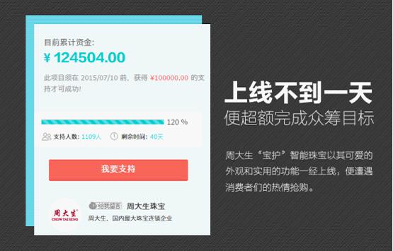 周大生首款儿童智能珠宝——“宝护”在淘宝众筹30天后,以10倍的目标完成率、众筹1010953元的销售额,为新型智能珠宝的市场前景交出完美答卷。