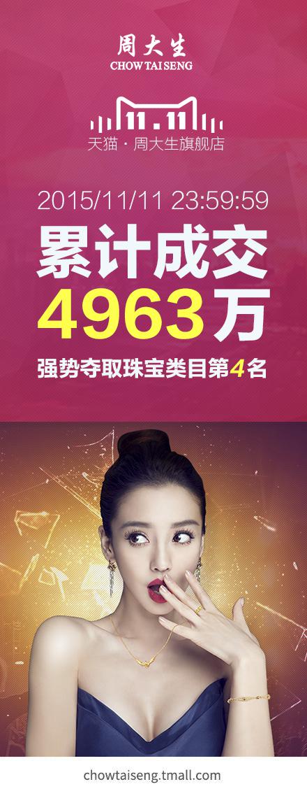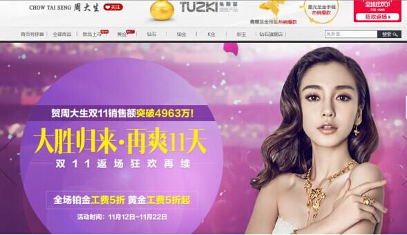 据周大生天猫旗舰店的销售数据显示,截止到11日24时,周大生线上交易额超49630000元,位列京东珠宝类目销售第三,天猫珠宝类第四,在其他数个交易平台也名列前茅,创下诸多排名记录。