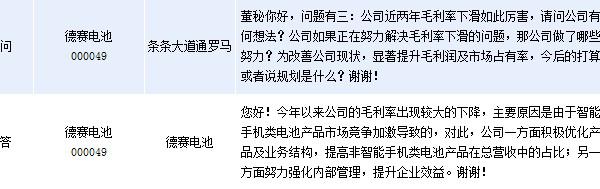 全景网12月11日讯 周五德赛电池(000049)在全景网互动平台上表示, 今年以来公司的毛利率出现较大的下降,主要原因是由于智能手机类电池产品市场竞争加剧导致的,对此,公司一方面积极优化产品及业务结构,提高非智能手机类电池产品在总营收中的占比;另一方面努力强化内部管理,提升企业效益。