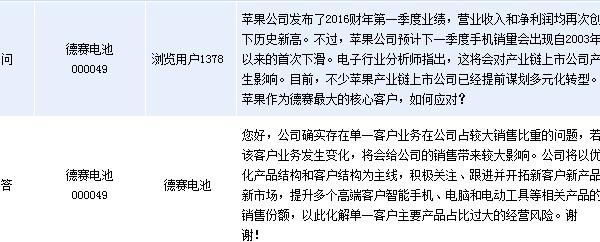 全景网2月1日讯 周一德赛电池(000049)在全景网互动平台上表示,公司确实存在单一客户业务在公司占较大销售比重的问题,若该客户业务发生变化,将会给公司的销售带来较大影响。公司将以优化产品结构和客户结构为主线,积极关注、跟进并开拓新客户新产品新市场,提升多个高端客户智能手机、电脑和电动工具等相关产品的销售份额,以此化解单一客户主要产品占比过大的经营风险。