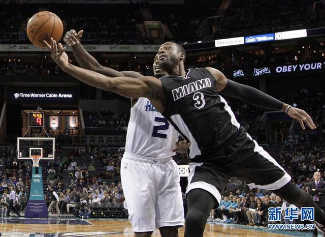 12月9日,热火队球员韦德(右)与黄蜂队球员威廉姆斯拼抢。当日,在2015-2016赛季NBA常规赛中,迈阿密热火队客场以81比99不敌夏洛特黄蜂队。 新华社/美联