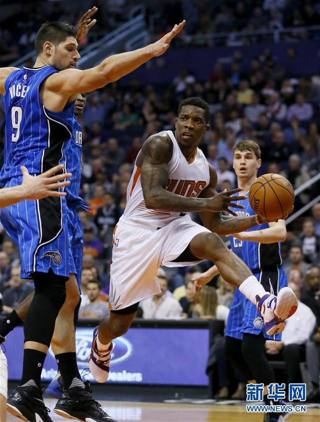 12月9日,太阳队球员布莱索(右)在比赛中伺机传球。当日,在2015-2016赛季NBA常规赛中,菲尼克斯太阳队主场以107比104战胜奥兰多魔术队。 新华社/美联