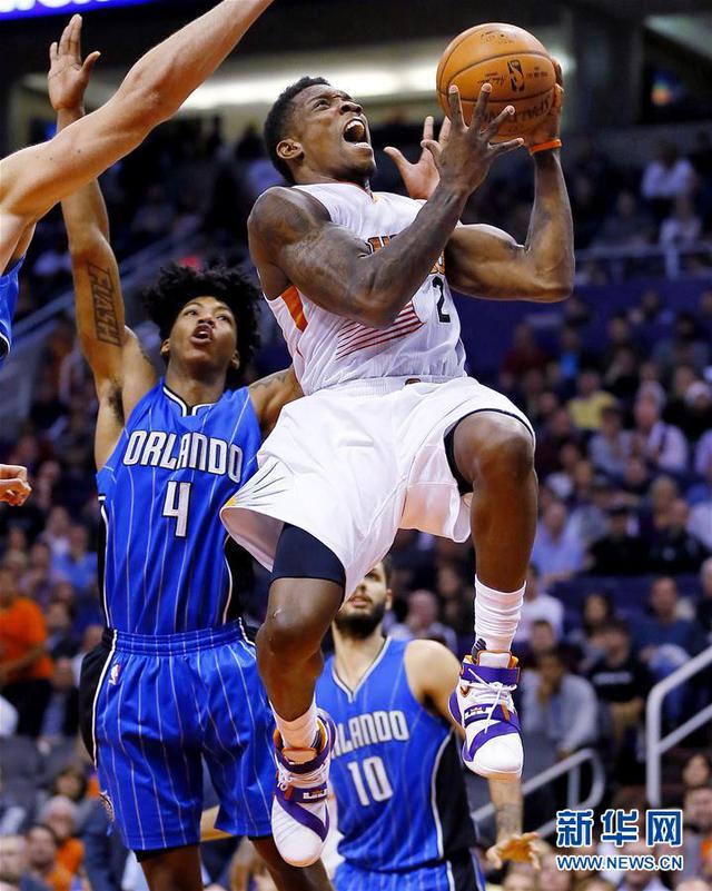 12月9日,太阳队球员布莱索(右)在比赛中上篮。当日,在2015-2016赛季NBA常规赛中,菲尼克斯太阳队主场以107比104战胜奥兰多魔术队。 新华社/美联