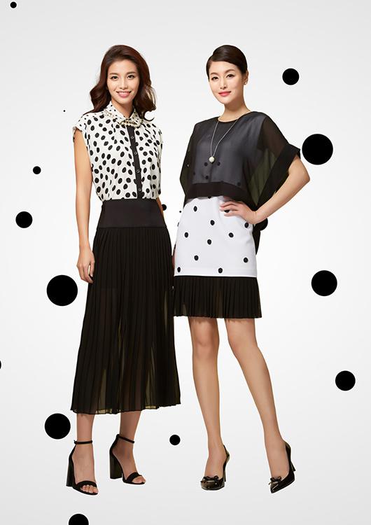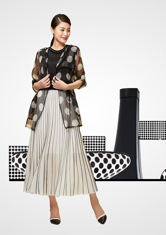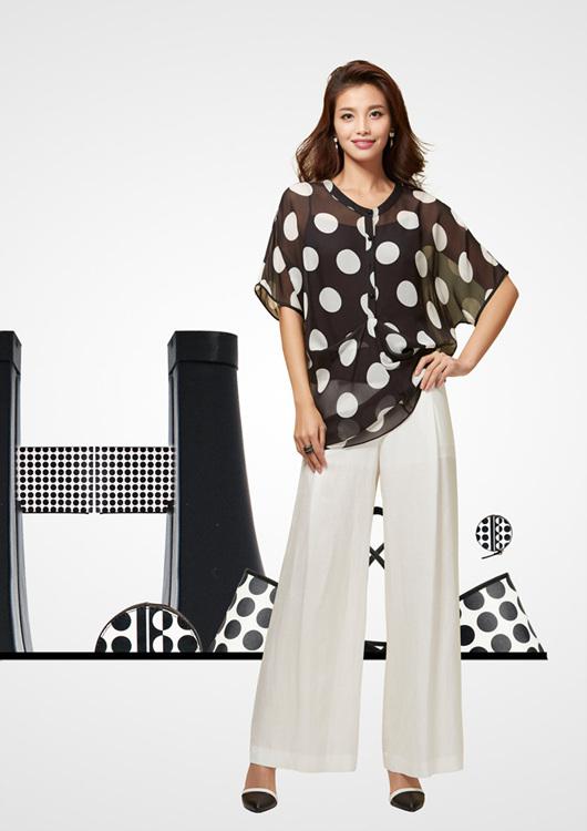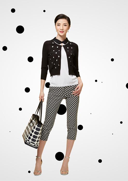 黑白波点加上经典的哈伦裤、赫本式复古A摆裙,潇洒、活泼,整身小波点图案,给人带来美妙的视觉感受,彰显优雅的女性魅力。