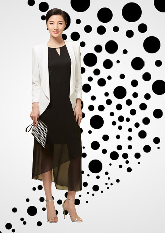 黑白波点的配色还原了服装的经典。两件套式黑色连体裤,精心点缀了白色波点打籽绣装饰。黑色修长款连衣裙,飘逸的雪纺裙摆与小V领的设计,都使其不落俗套。