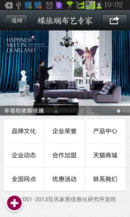 蝶依斓布艺专家走在行业创新前沿,在2014版官方网站更新升级的同时聘请专业的微网站策划团队,开发时下最流行微网站并于近日已正式上线。服务号微网站设置包括企业动态、合作加盟、产品中心、品牌文化、全国网点、企业荣誉、联系我们等栏目,力求为有需求的客户提供一个更好的服务平台,将幸福家居产品通过移动客户端带给广大消费者。