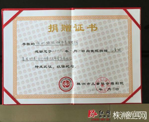 株洲市儿童福利院给蝶依斓颁发捐赠证书