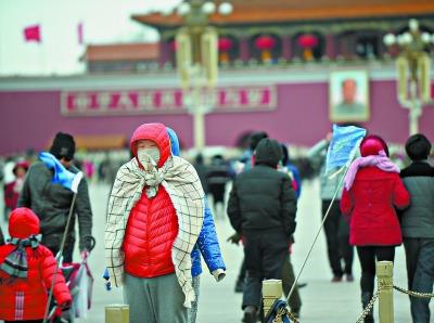 京城连续两日大风降温,行人都裹得严严实实的。在天安门广场,一位游客裹着毯子抵御风寒。本报记者 方非摄