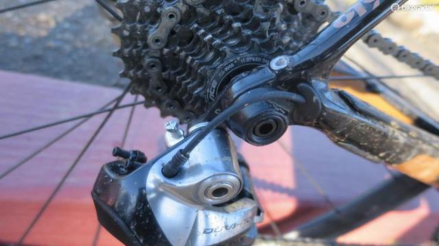 后桶轴的设计非常合理。轮组和后拨尾钩同时锁紧在桶轴之内,保证了后拨导轮与飞轮能够时刻平行。