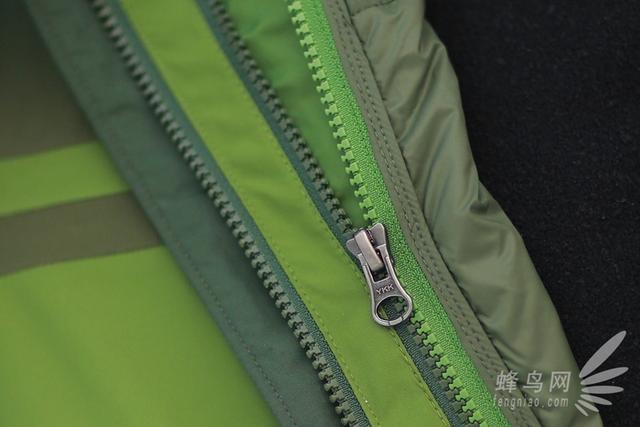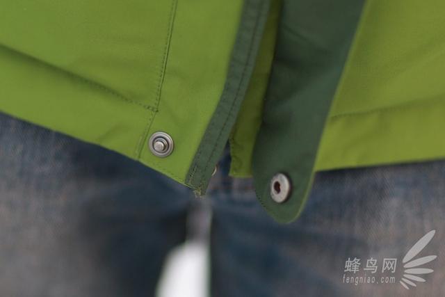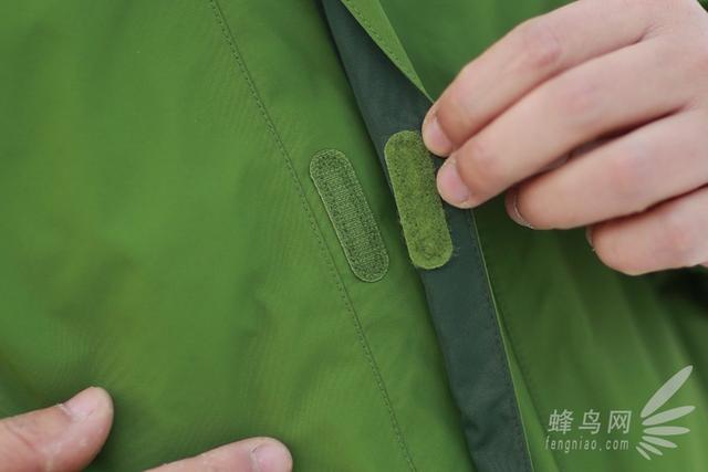 在前部拉链外侧,其采用了魔术贴闭合方式,并采用了结构式防水设计,当我拉上拉链之后,无需要再单独和别的衣服一样一个按扣一个按扣的去闭合,魔术贴闭合方式最大的好处就是开闭合方便,而且外部还采用了结构式防水设计。我觉得这个地方的设计是这件衣服最为巧妙的地方。
