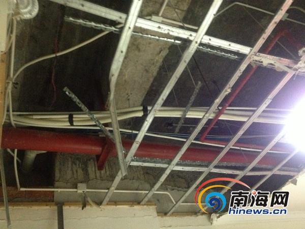 大厦三层爆裂的消防管及完全脱落的天花板