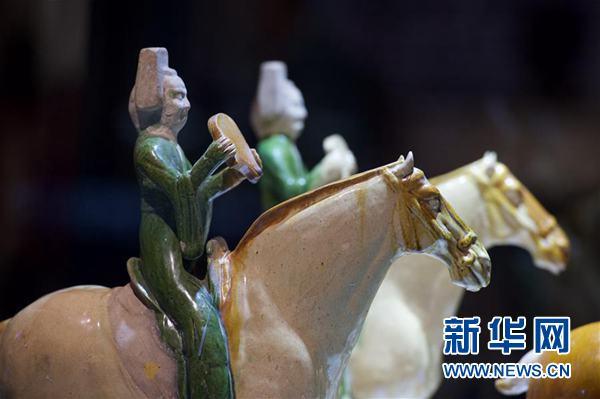 河南博物院的唐代三彩骑马持排箫男乐俑在台湾展出。新华社记者姜克红摄