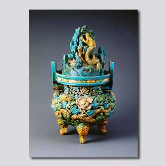 首都博物馆藏。仿汉代博山炉式样。陶胎。直口、短颈、丰肩、鼓腹,腹下承三兽足。颈部两侧饰对称桥耳,盖与炉用槽口衔接,炉体镂空。炉盖镂雕成层峦叠嶂的山峰,黄色蟠龙蜿蜒穿行于蓝色的山崖间,神态刻画生动。炉身遍体浮雕花枝、云朵。腹部一侧雕昂首展翅的飞凤,一侧雕回首凝视的蟠龙,飞凤和蟠龙相逐游翔于以蓝、绿、白色相间装饰的枝叶茂盛的缠枝牡丹花丛中,显得格外醒目。通体饰孔雀蓝、草绿、黄、白诸多色彩。镂雕工艺与绚丽的色彩相结合,呈现出华丽的装饰效果。