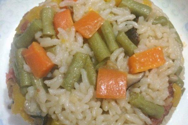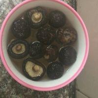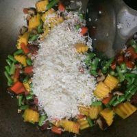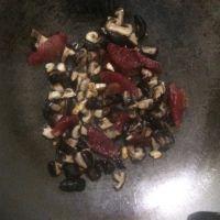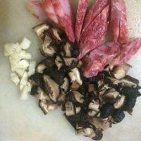 5. 香菇切碎。腊肠切片。蒜切碎。