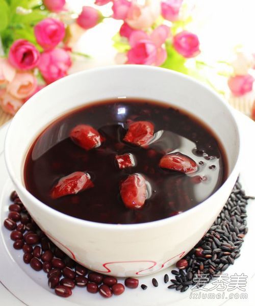 材料:黑米100克、红豆80克、红枣10粒、冰糖少许