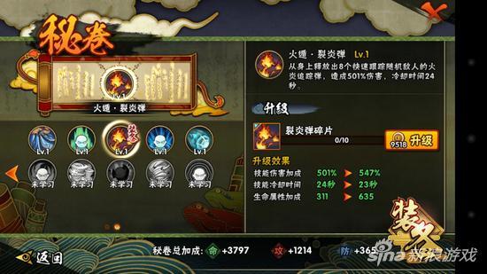 火遁·裂炎弹:从身上释放出8个快速跟踪敌人的火炎追踪弹,造成501%伤害,冷却时间24秒。