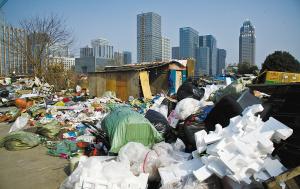 在靠近泰安西路的地方,有不少拾荒者安家,地上全都是捡来的破烂。一名拾荒者说,这些东西都是他们从外面捡来的,这块空地已经两三年了,由于没人管,他们就搭了窝棚住下来。还有一名拾荒者告诉记者,在这儿居住的拾荒者有数十人,每天有大量捡来的废品运进来,不能卖钱的就堆起来。