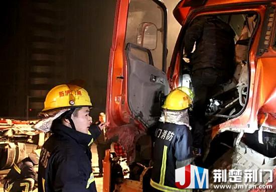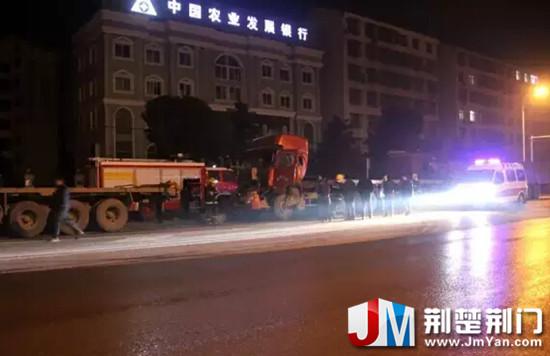 荆楚荆门网讯(罗蒙 胡腾羽)1月18日0时左右,荆门市沙洋县洪岭大道南胜鑫大酒店门口发生一起交通事故,造成3辆大挂车连环追尾,当地公安、消防、医疗等部门迅速赶赴现场。