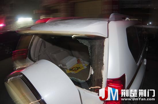 图为:越野车玻璃被砸价值一万多元的烟酒被盗