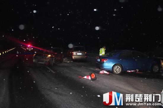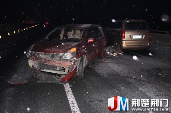 21日凌晨6时许,随岳高速公路京山段156公里桥面发生多车相撞的交通事故。早晨6点04分,湖北省高警京山大队值班室接到一起交通事故报警,司机称在湖南往随州方向发生事故,具体公里数不明。就在值班民警与司机通话过程中,又听了到一声猛烈的撞击声,司机惊恐未定,赶紧说了句“你们快来”,便挂断了电话。民警立即通知了路面巡逻民警,安排民警沿着司机描述的方向巡逻查找。值班民警再次回拨了电话,指导报警司机查看具体公里牌,并要求报警司机通知所有人员下车,撤离至桥头高速公路护栏外。因为雪天在高速公路桥面非常危险,一旦后方来车打滑刹车,很可能撞到现场的人员。就在民警赶往事故现场的过程中,高警大队值班室又接到了几位司机报警,称在同一位置桥面发生了事故,有几名乘客居然怕冷坐在车内不想出来,还有一人在下车查看自己行李和物品时被撞伤,幸好只是轻微皮外伤。几分钟时间,处置民警到达事故现场,经过现场查勘,共有8辆车在桥面发生事故,均因车速过快,上桥面前未提前降低车速,部分司机上桥发现车辆打滑后,还踩了急刹车,导致车辆加速偏离方向发生交通事故。