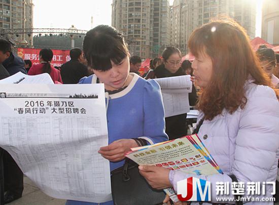 荆楚荆门网讯(罗蒙 袁恬)2月17日,荆门市掇刀区星球商业中心广场上人潮涌动、热闹非凡。由荆门高新区管委会·掇刀区人民政府主办,掇刀区人力资源和社会保障局承办的“服务企业用工·促进就业创业”2016年“春风行动”大型招聘会在这里举行。本次招聘会吸引近3万名求职者参加,达成意向2876人。