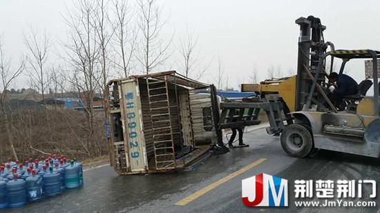 21日下午4时许,钟祥市洋梓镇敖河村万年寺桥附近发生一起交通事故,一辆车厢内装着桶装纯净水的白色货车由北向南行驶至该路段时,因避让路旁突然窜出的摩托车失控侧翻,不少桶装水变形破损,导致现场大量车辆拥堵、滞留。为避免交通堵塞,货车司机打电话联系叉车前来,将侧翻的货车扶正,交通重新恢复正常。