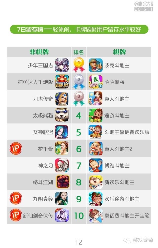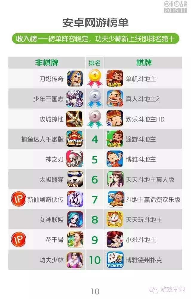 安卓网游榜单中,收入榜保持稳定,功夫少林冲进前十,位列第十位。同时,由于其较大的推广力度,功夫少林也成功登顶热度榜首位。7日留存榜上,轻休闲、卡牌题材用户留存水平较好。