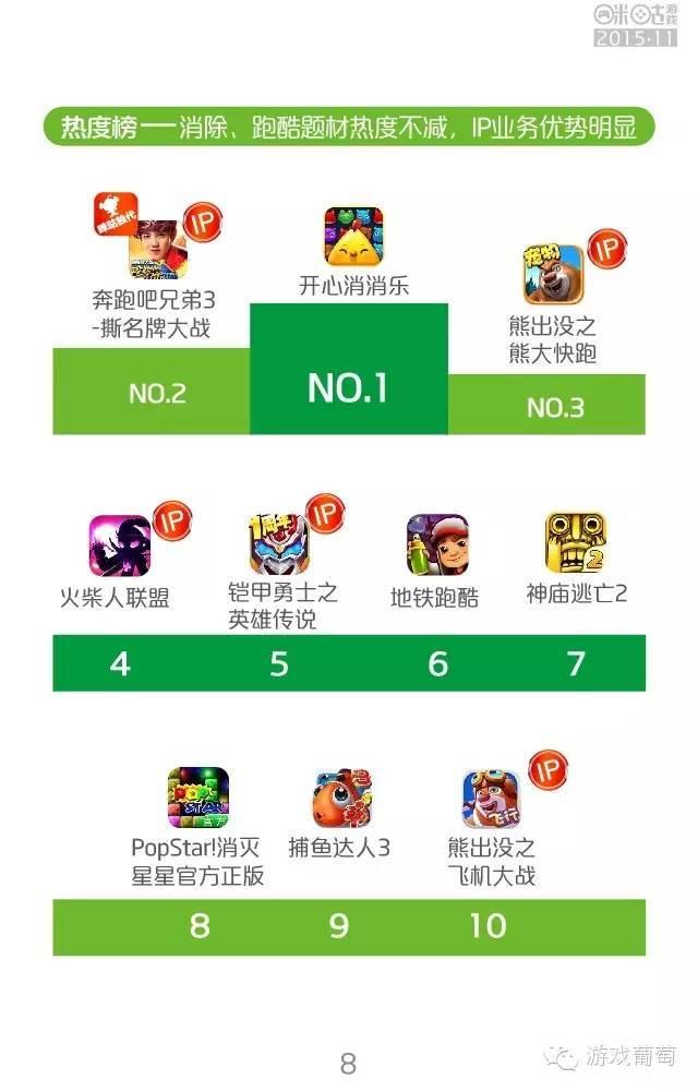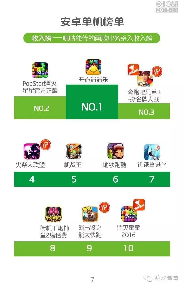 安卓单机榜单中,咪咕独代的两款业务杀进收入榜,分别是《奔跑吧兄弟3-撕名牌大战》和《消灭星星2016》。热度榜上,消除、跑酷题材热度不减,ip业务优势明显,前五名即有4款ip产品。