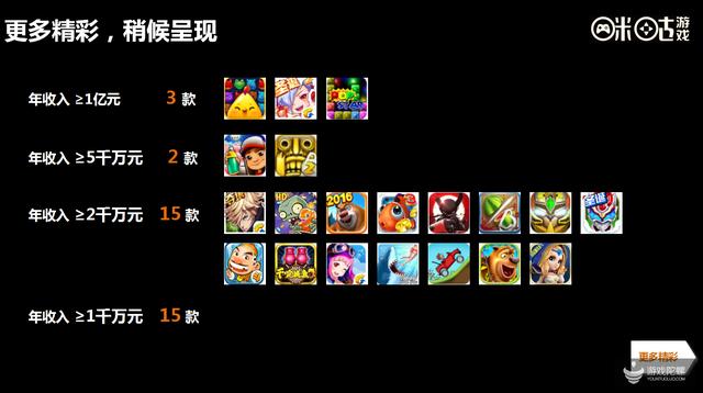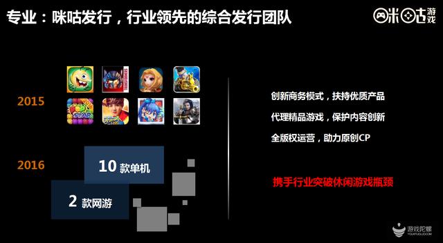 咪咕做发行依然走的是精品式战略,聚焦在手机休闲单机市场为主。王刚表示,保持发行和自有产品的快速发展是咪咕互娱2016年的重要发展目标:发行领域,咪咕互娱计划发行10款单机、2款网游;自有产品方面,在推出咪咕棋牌、咪咕善跑的基础上,2016年咪咕互娱将合力打造游戏视频客户端——咪咕游玩,通过手游视频社区的建设,汇聚更多的精品游戏与优质玩家。