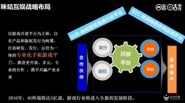 以游戏开放平台为主体,通过自研产品和发行作为两翼,打造一个自研、发行、运营为一体的专业化手机平台。推进更家开放、多元、合作共赢的产业的局面。这是2016年的战略布局。