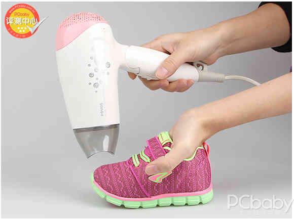 用吹风机吹鞋子表面,放于鞋内的手能够感受到吹风的热气,这说明鞋子的透气性较好,能够使孩子的双脚保持持久干爽。