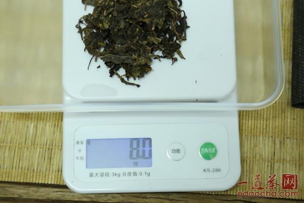 鉴赏干茶完毕之后,接下来我们开始撬茶并称取8g干茶用于评鉴。这样既能保证茶汤口感,又能较好的观赏它的外形。不过因为茶梗,撬茶时需要小心,茶梗比茶叶更具韧性,很容易把茶叶撬碎。